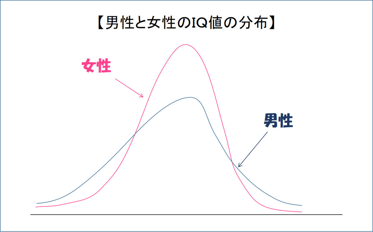 数少ない天才は男性から発生しますが、ランダムに一人を選ぶとすると女性のほうが男性よりもIQが高い場合が多いことが、IQの分布を見ればわかります。