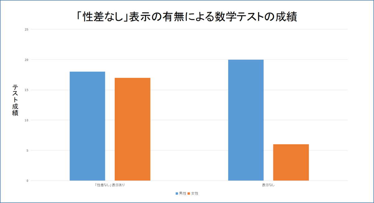 このように、この実験では「性差がない」と表示されたテストでは、男女間で成績の差は無かったのですが、その表示を無くした途端、女子学生の成績が急激に低下してしまいました。